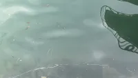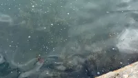 От генмола и до водной станции вода сверху имеет непрозрачный цвет и покрыта жирной пленкой.