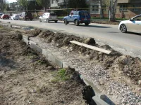 Со стороны кургана укладывают бордюрный камень вдоль намеченного тротуара.