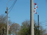 Накануне символику крепили на столбах уличного освещения вдоль Адмиралтейского проезда.