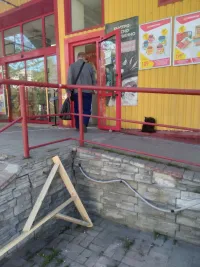 Зайти в супермаркет сегодня можно только по пандусу через обычную дверь, раздвижные и широкие - недоступны.