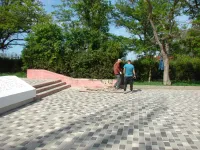 Территорию вокруг памятного знака "Факел" выложили тротуарной плиткой, сам Факел покрасили.