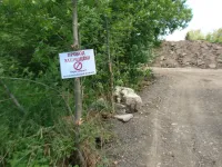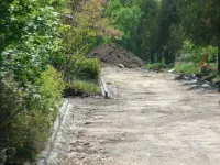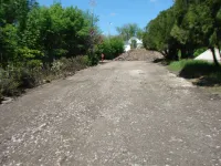 Весь снятый слой старого асфальта с центральных аллей собрали в огромную кучу и приготовили к вывозу.
