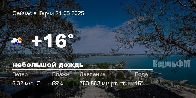 Сегодня днем в Керчи, 21 мая, ожидается небольшой дождь, температура воздуха от +12.5° до +17.3°С, ветер северный 5.55 м/с, порывы до 9.82 м/с, давление 764.3 мм рт. ст., влажность 66%.