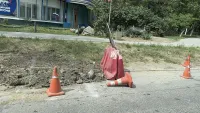 Место все также ограждено конусами и предупреждающим дорожным знаком.