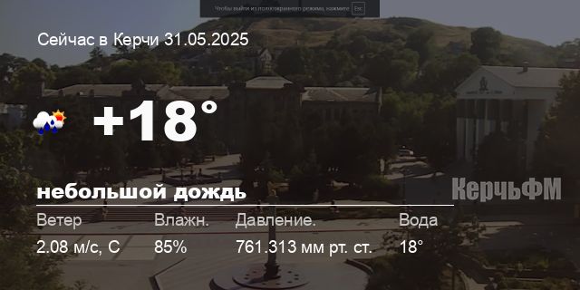 Сегодня днем в Керчи, 31 мая, ожидается небольшой дождь, температура воздуха от +15.7° до +21.2°С, ветер северный 1.62 м/с, порывы до 3.16 м/с, давление 761.3 мм рт. ст., влажность 74%.
