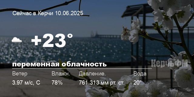 Сегодня днем в Керчи, 10 июня, ожидается ясная погода, температура воздуха от +22.1° до +24.8°С, ветер 4.27 м/с, порывы до 6.04 м/с, давление 761.3 мм рт. ст., влажность 76%.
