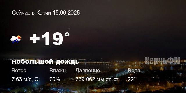 Сегодня днем в Керчи, 15 июня, ожидается небольшой дождь, температура воздуха от +16.3° до +20.2°С, ветер северный 7.26 м/с, порывы до 7.63 м/с, давление 758.3 мм рт. ст., влажность 73%.