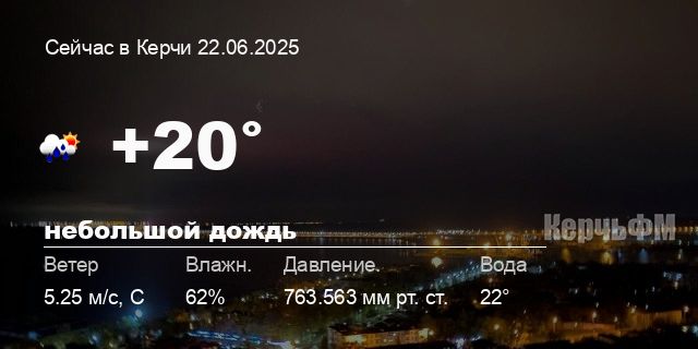 Сегодня днем в Керчи, 22 июня, ожидается ясная погода, температура воздуха от +17.1° до +21.5°С, ветер северный 3.2 м/с, порывы до 6.86 м/с, давление 762.8 мм рт. ст., влажность 56%.