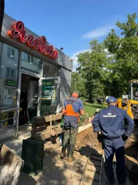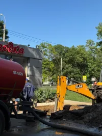 На место уже приехала бригада рабочих водоканала и проводят работы. Продолжают рыть. Воду с грязью сливают на проезжую часть.