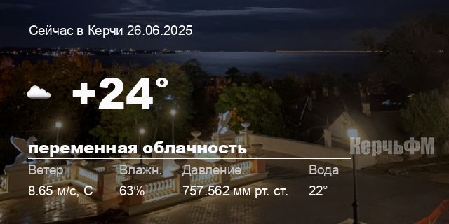 Сегодня днем в Керчи, 26 июня, ожидается ясная погода, температура воздуха от +20° до +25.3°С, ветер северный 7.5 м/с, порывы до 8.65 м/с, давление 757.6 мм рт. ст., влажность 67%.