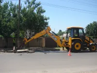 Тяжелая техника снимает старые бордюры вдоль улицы Кирова в районе Сморжевского-супермаркет "Яблоко".