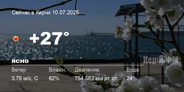 Сегодня днем в Керчи, 10 июля, ожидается ясная погода, температура воздуха от +24° до +28.4°С, ветер северный 4.43 м/с, порывы до 5.49 м/с, давление 754.6 мм рт. ст., влажность 60%.