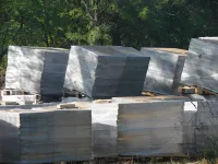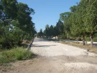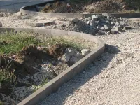 По уже освобожденным участкам прокладываются пешеходные дорожки с бордюрами.