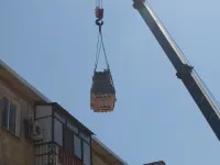 Поднимают их на крышу, а также снимают демонтированную с помощью подъемного крана.