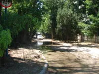Из под люка вода бьет двумя фонтанами и растекается по дорогам вдоль домов частного сектора.