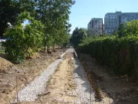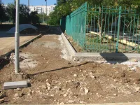 После укладки в грунт электрического кабеля для новых опор уличного освещения, у садика установили вдоль тротуара бордюры и засыпали его щебнем.
