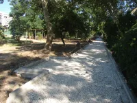 На центральной аллее укладку бордюров начали от школы и дошли уже до Спортивной школы олимпийского резерва по художественной гимнастике.