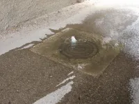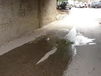 Под аркой в районе дома Марата, 7 из под люка бьет фонтан воды.