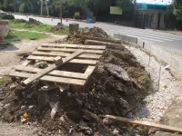 Дело в том, что при укладке бордюрного камня на съезде с Кирова на дорогу- дублер были выкопаны траншеи, и через них положены деревянные настилы для прохода.