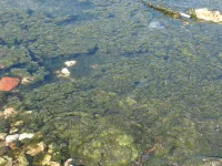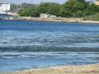 Причина в водорослях у берега и больших островков тины на поверхности водной глади в десятке метров от него.