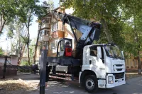 Сотрудники Службы городского хозяйства готовят придомовую территорию к предстоящему благоустройству, применяя 22-метровую вышку.