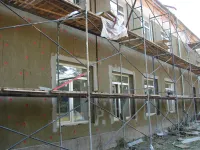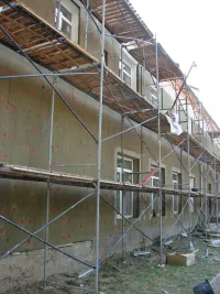 Рабочие подрядной организации "КСИБ" возвели строительные леса и приступили к его утеплению.