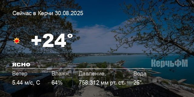 Сегодня днем в Керчи, 30 августа, ожидается ясная погода, температура воздуха от +23.2° до +26°С, ветер северный 3.82 м/с, порывы до 10.29 м/с, давление 757.6 мм рт. ст., влажность 67%.