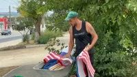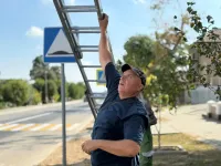 На улице Чкалова специалисты Службы городского хозяйства выполняют замену флажков на столбах освещения.