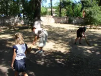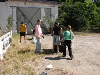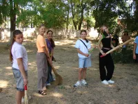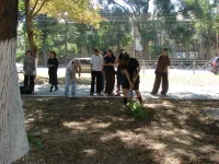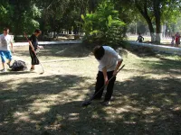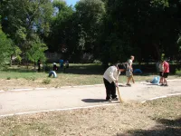 У школы № 17 ученики удаляли проросшую траву между тротуарными плитами, расчищали газоны от опавшей листвы, подрезали отросшие ветки на низкой высоте, подметали дорожки, расчищали свой небольшой стадион.