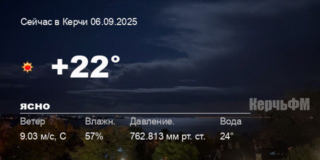 Сегодня днем в Керчи, 06 сентября, ожидается ясная погода, температура воздуха от +20.7° до +23.2°С, ветер северный 8.45 м/с, порывы до 9.03 м/с, давление 762.1 мм рт. ст., влажность 55%.