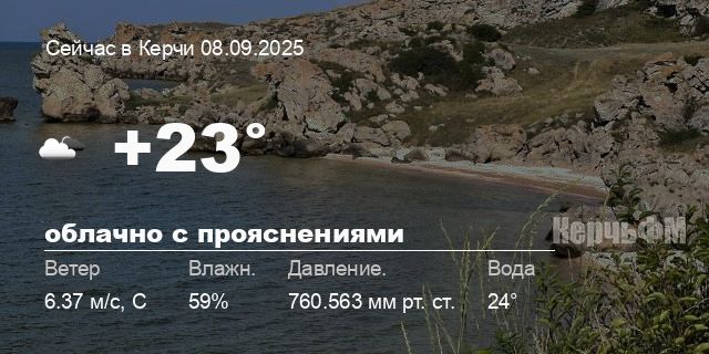 Сегодня днем в Керчи, 08 сентября, ожидается ясная погода, температура воздуха от +20.3° до +24.6°С, ветер северный 7.42 м/с, порывы до 6.37 м/с, давление 759.8 мм рт. ст., влажность 61%.