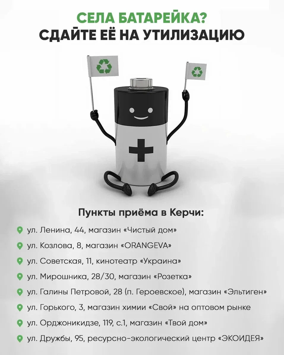В Керчи организованы специальные пункты приёма батареек. Администрация города призывает горожан не лениться и завести дома отдельную коробочку, и время от времени сдавать использованные батарейки на утилизацию. Об этом сообщает пресс-служба администрации, - передает КерчьФМ