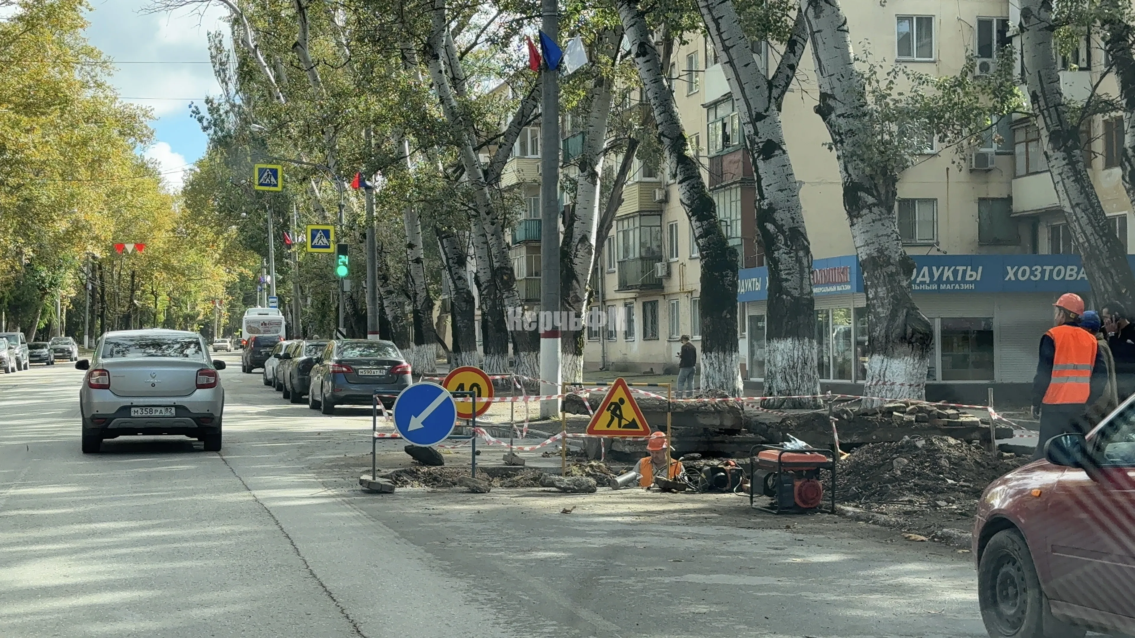 В настоящее время на улице Горького из-за работ по замене тепловых сетей перекрыты частично две полосы дороги. Перед работами установлены предупреждающие дорожные знаки.