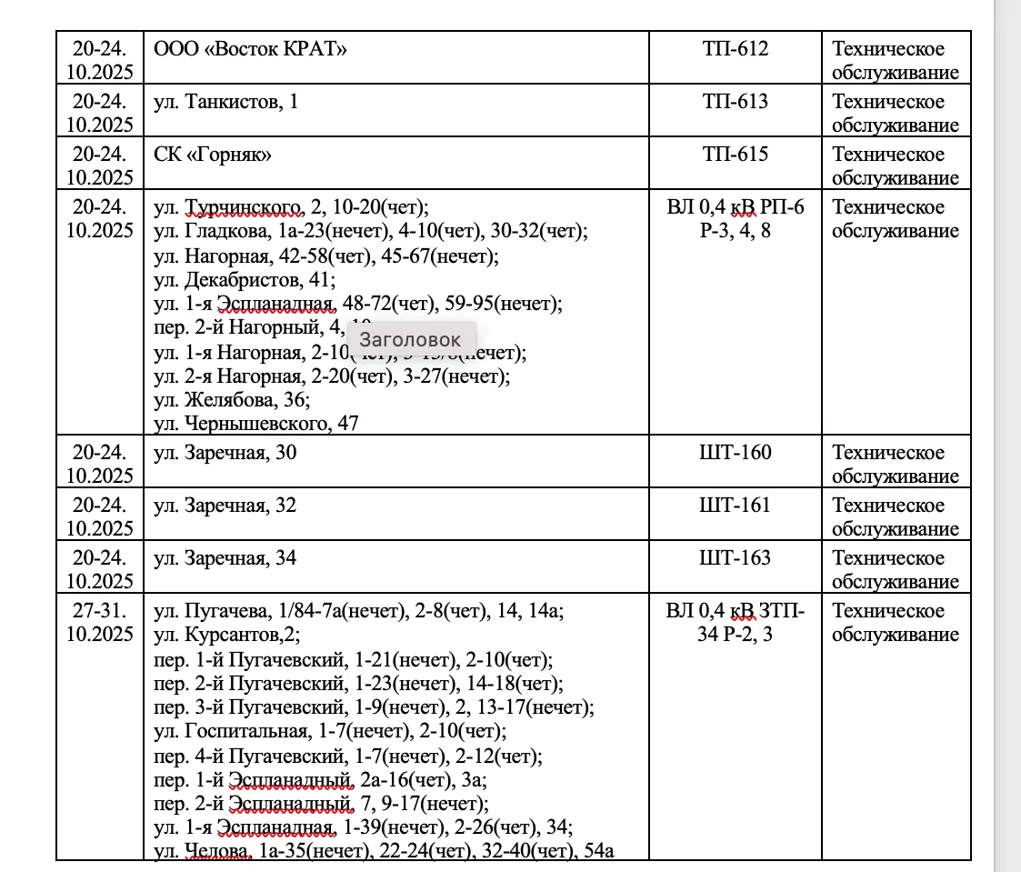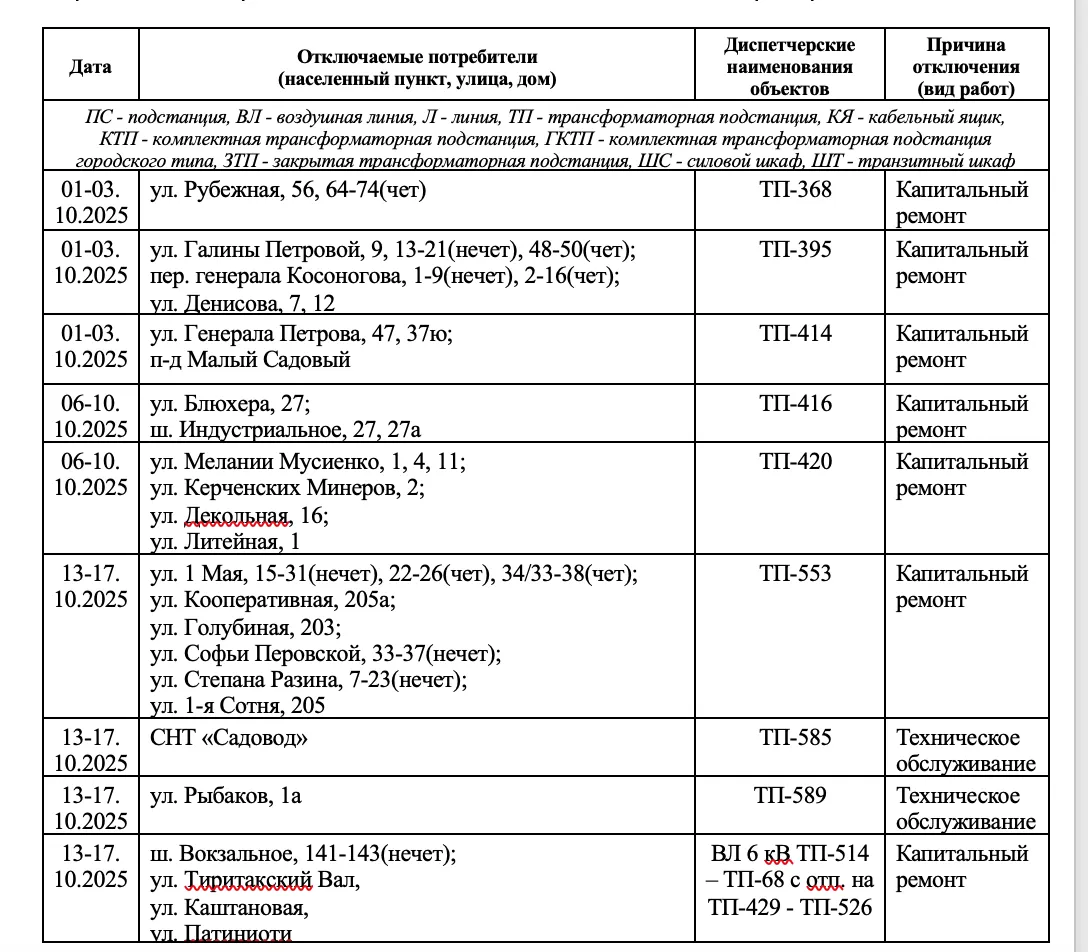 В связи с плановым ремонтом электрооборудования в октябре в период с 8 до 17 часов будут происходить отключения линий электропередачи согласно нижеприведенному графику. Об этом сообщает ГУП РК «Крымэнерго», - передает КерчьФМ.