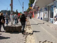 У торговых павильонов напротив центрального рынка по улице Еременко начали демонтировать старую тротуарную плитку.