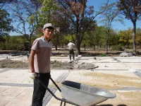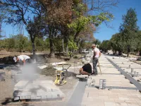 Специалисты подрядчика на уже уложенную плитку разбрасывают песок для того, чтобы заполнить им прогалины для лучшей ее устойчивости.