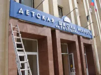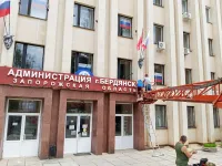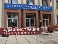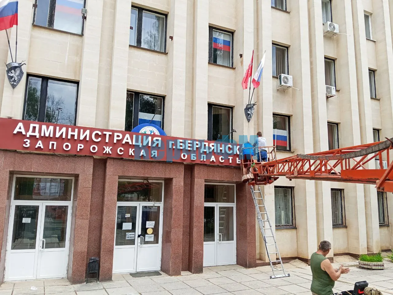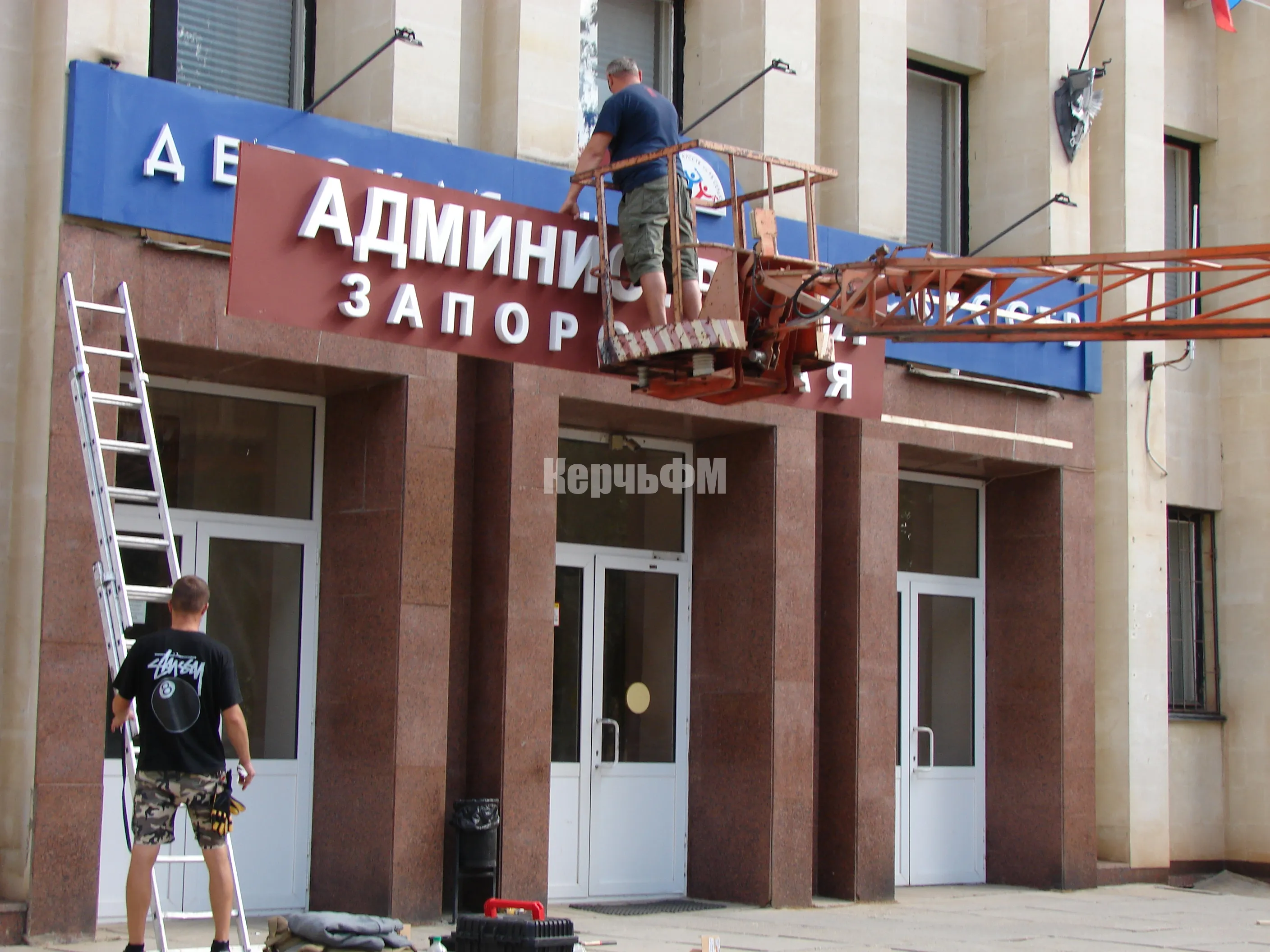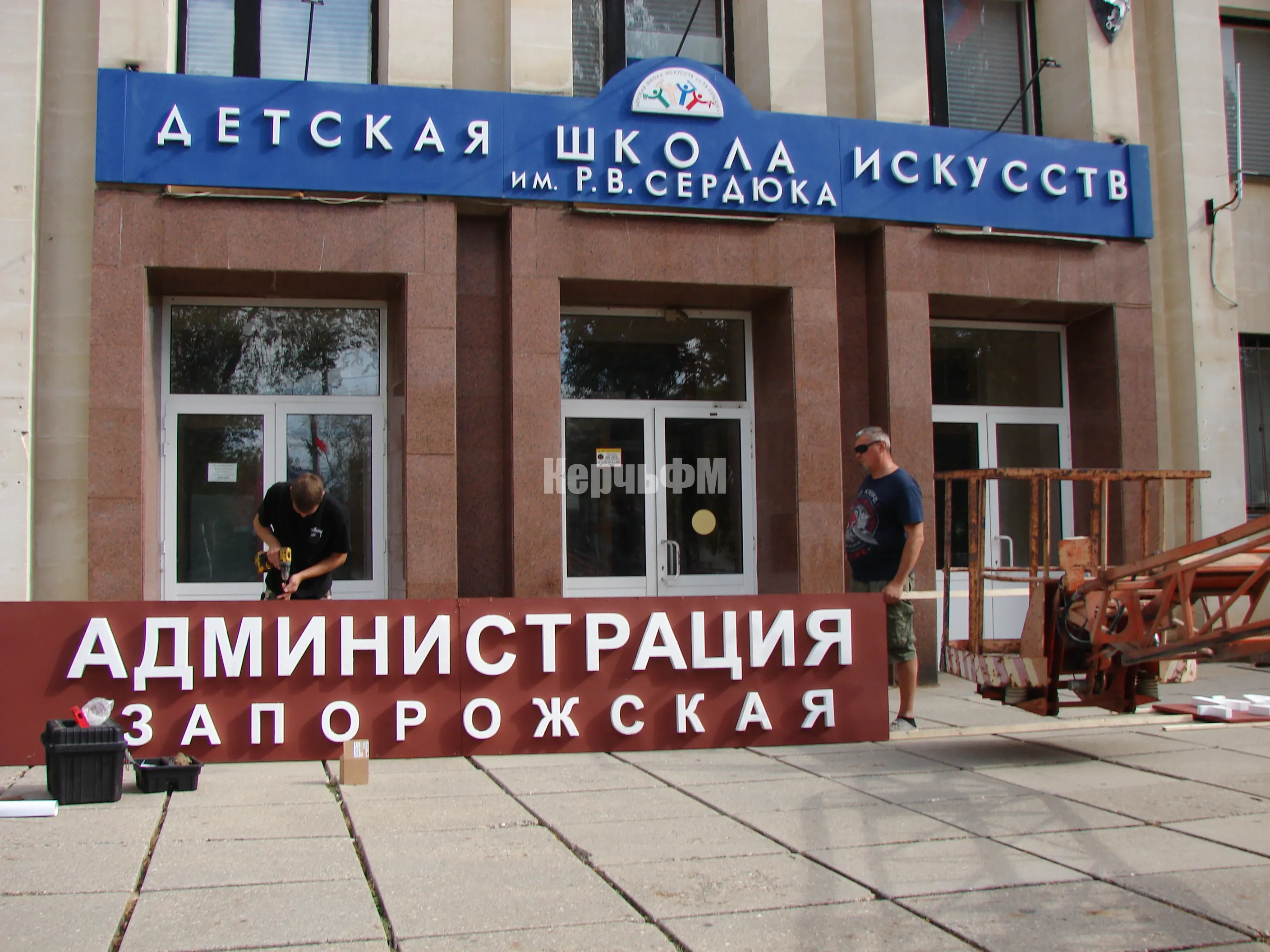 Вывеску под названием "Администрация г. Бердянска Запорожская область" на керченской Школе имени Романа Сердюка устанавливают во второй раз.