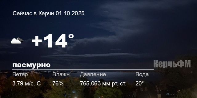 Сегодня днем в Керчи, 01 октября, ожидается пасмурная погода, температура воздуха от +12.3° до +16.4°С, ветер северный 3.29 м/с, порывы до 4.48 м/с, давление 764.3 мм рт. ст., влажность 69%.