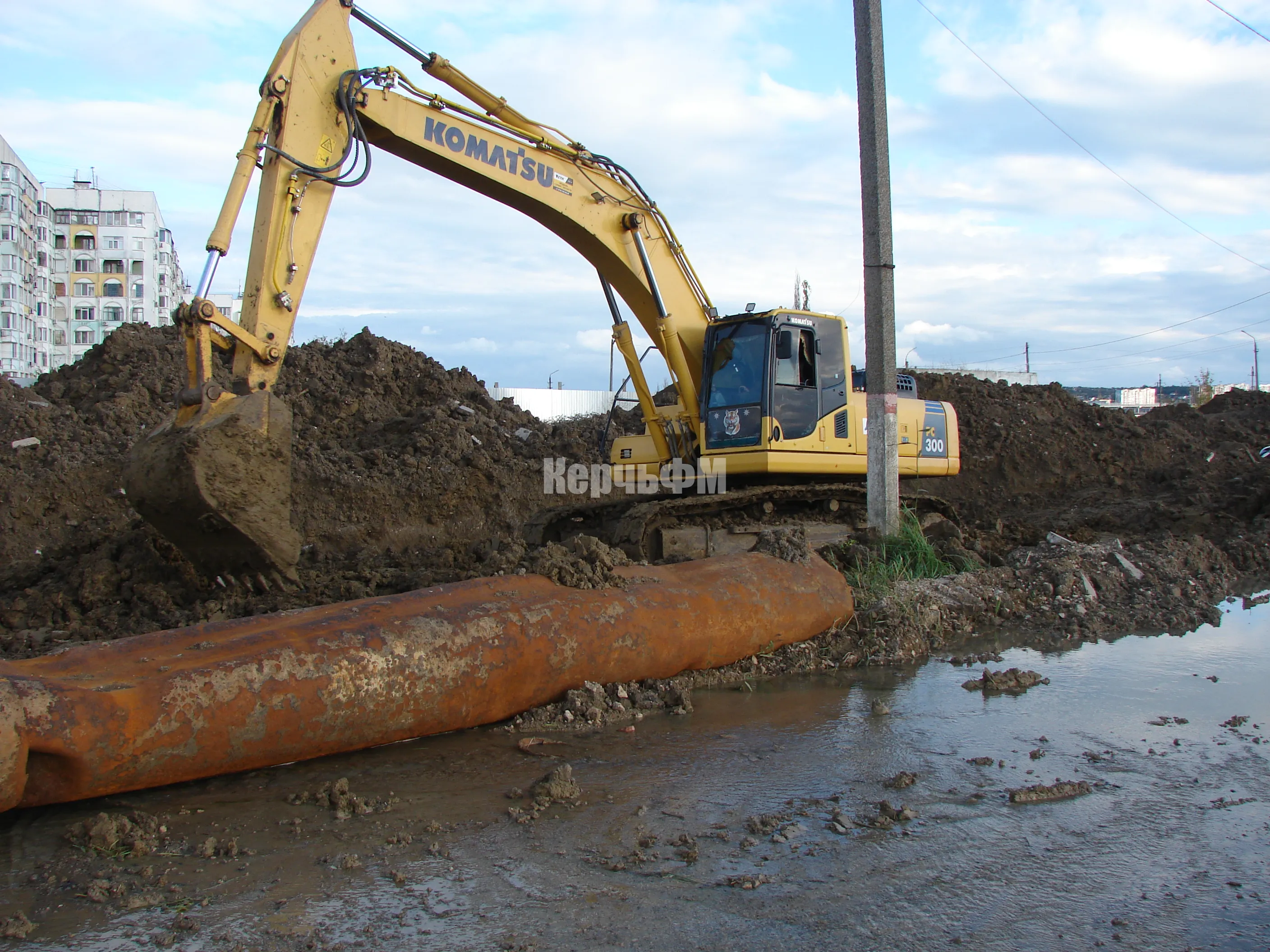 На Индустриальном шоссе тяжелая техника выравнивает разрытия на месте замены труб водовода.