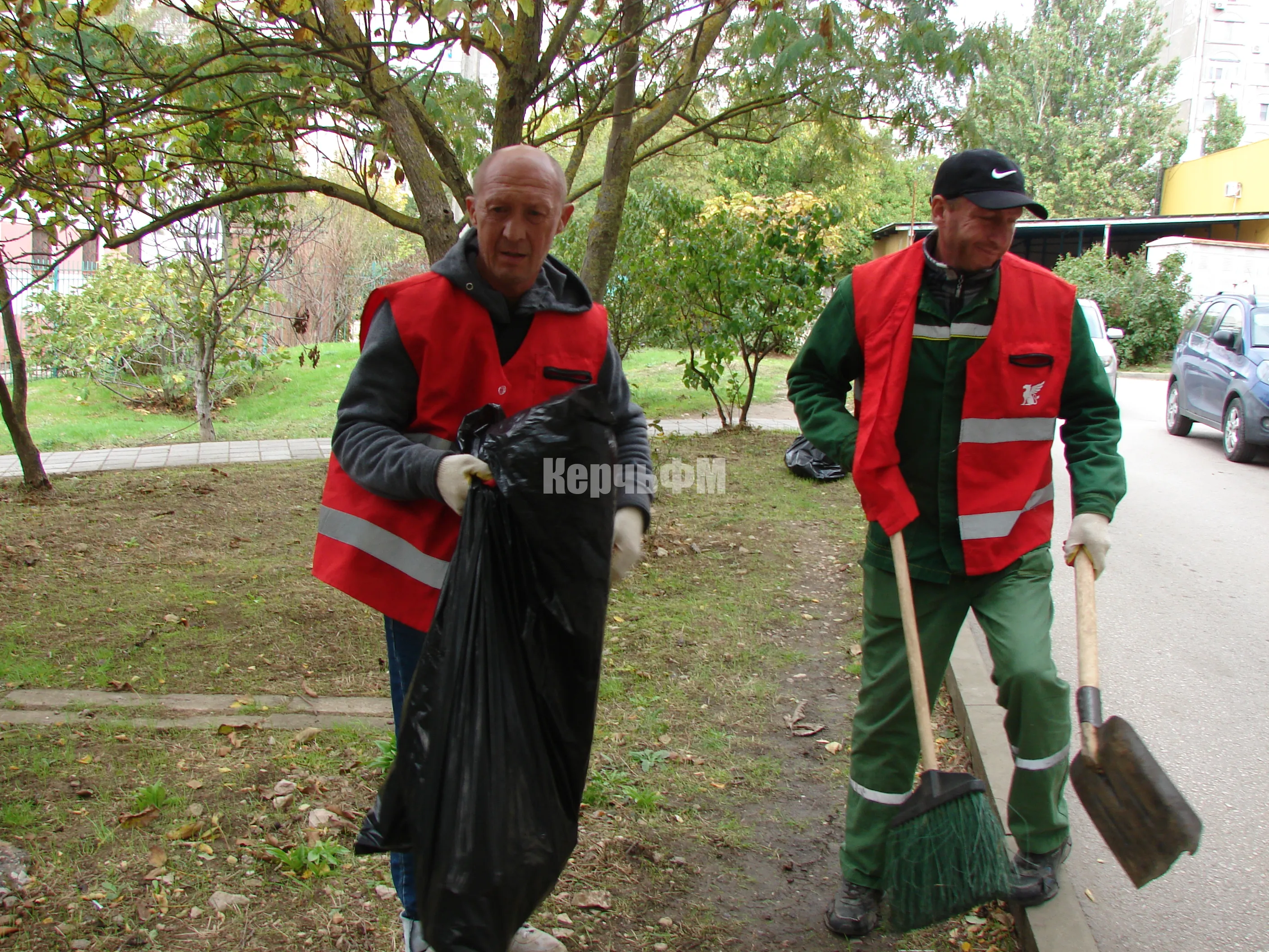 Рабочие убирают опавшие листья и мусор, а также устраняют последствия выпадения осадков.