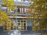 Здание красят в темно-синий и белый цвета.