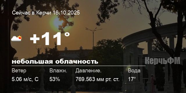 Сегодня днем в Керчи, 16 октября, ожидается небольшая облачность, температура воздуха от +10.2° до +11.7°С, ветер 4.3 м/с, порывы до 5.06 м/с, давление 769.6 мм рт. ст., влажность 50%.