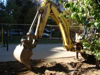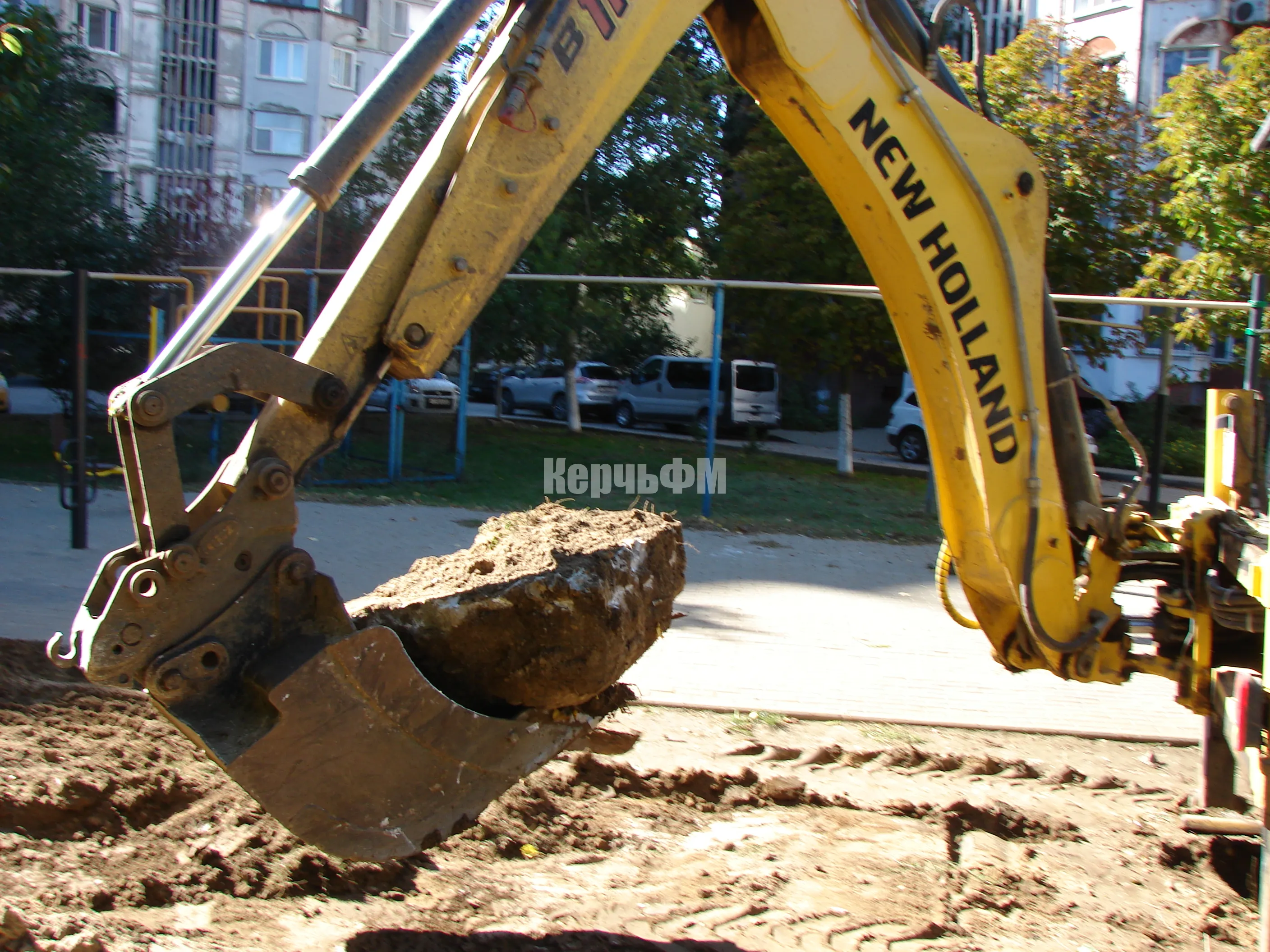 Экскаватор удаляет подземные большие камни, оставшиеся от оснований конструкций еще прошлого столетия.