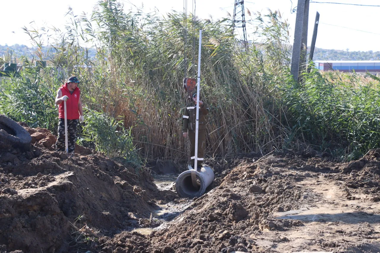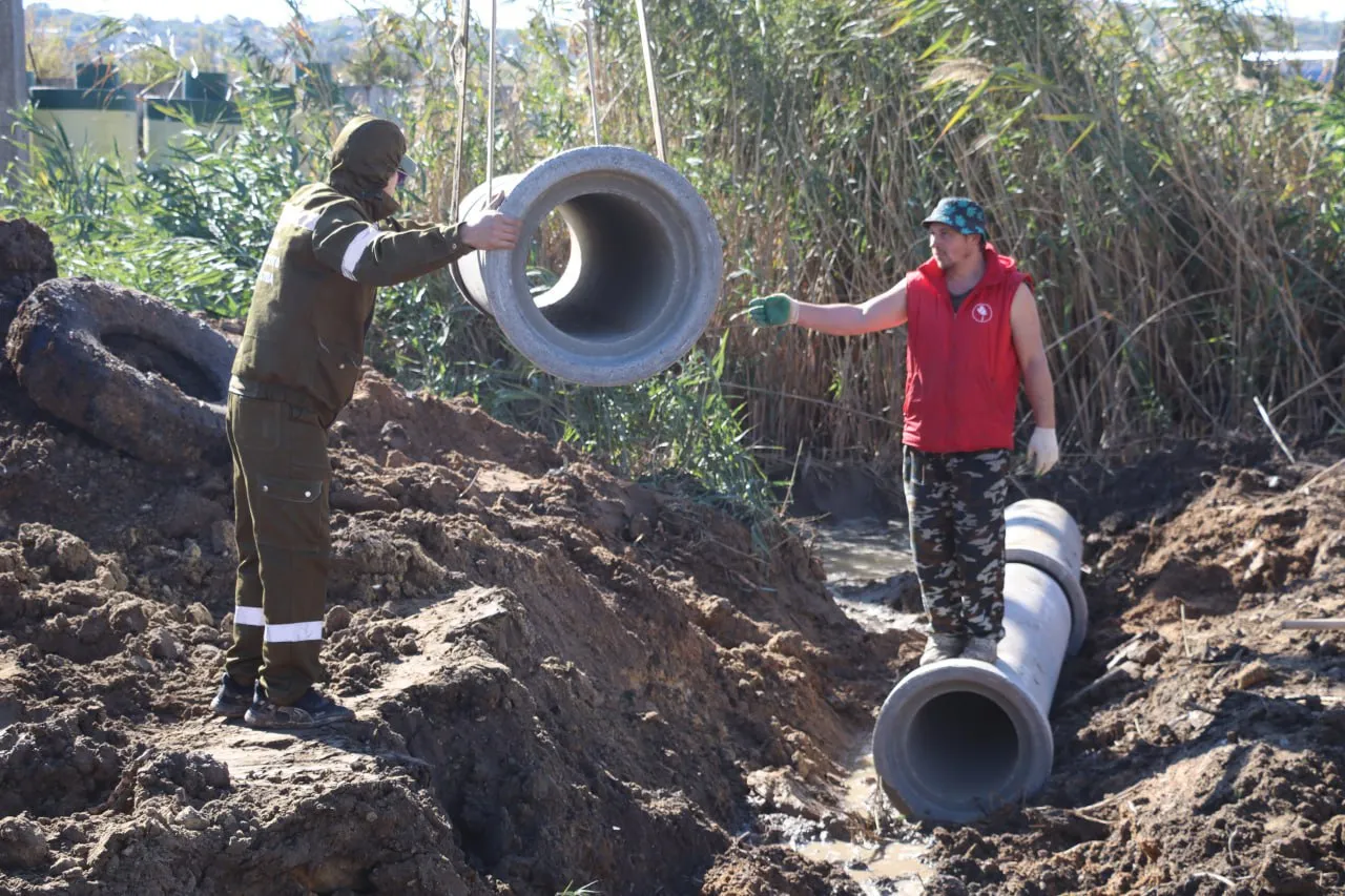 С помощью тяжелой техники сотрудники Службы городского хозяйства выкопали траншею, в которую закладывают трубы. По ним вода из бетонных лотков будет уходить в противоположном направлении от жилого массива", - сообщает пресс-служба администрации Керчи.
