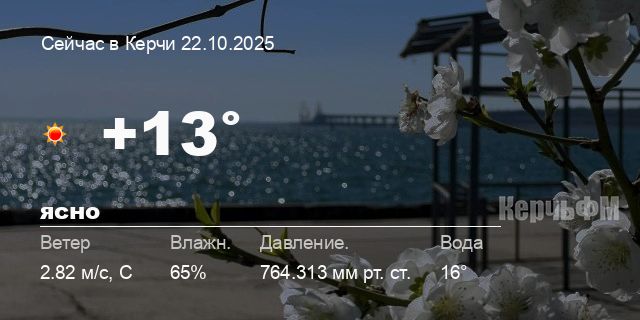 Сегодня днем в Керчи, 22 октября, ожидается ясная погода, температура воздуха от +10.5° до +15.9°С, ветер северный 3.44 м/с, порывы до 5.61 м/с, давление 763.6 мм рт. ст., влажность 66%.