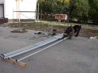 Рядом на территории мастера готовят флагштоки, которые установят справа от входа.