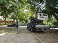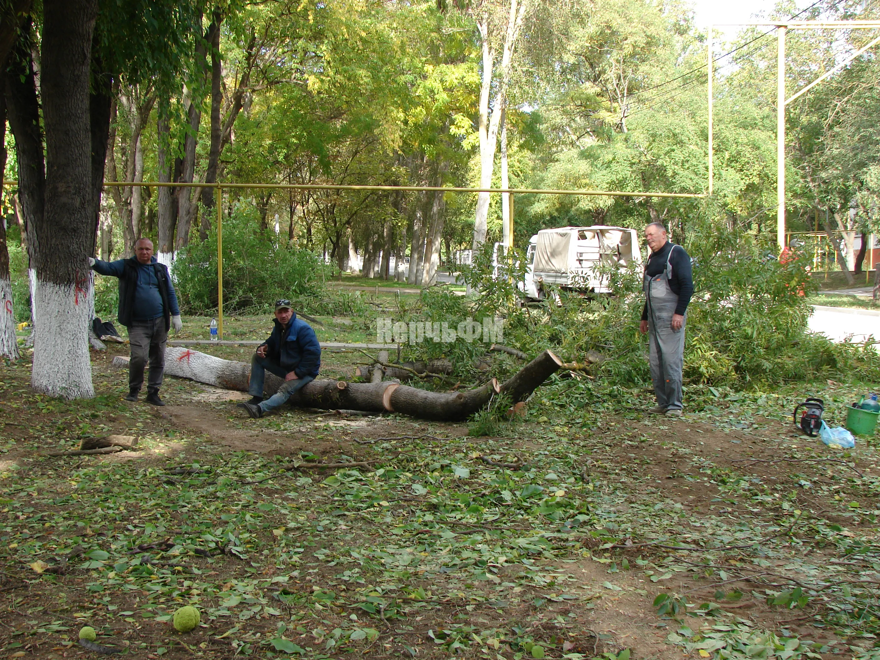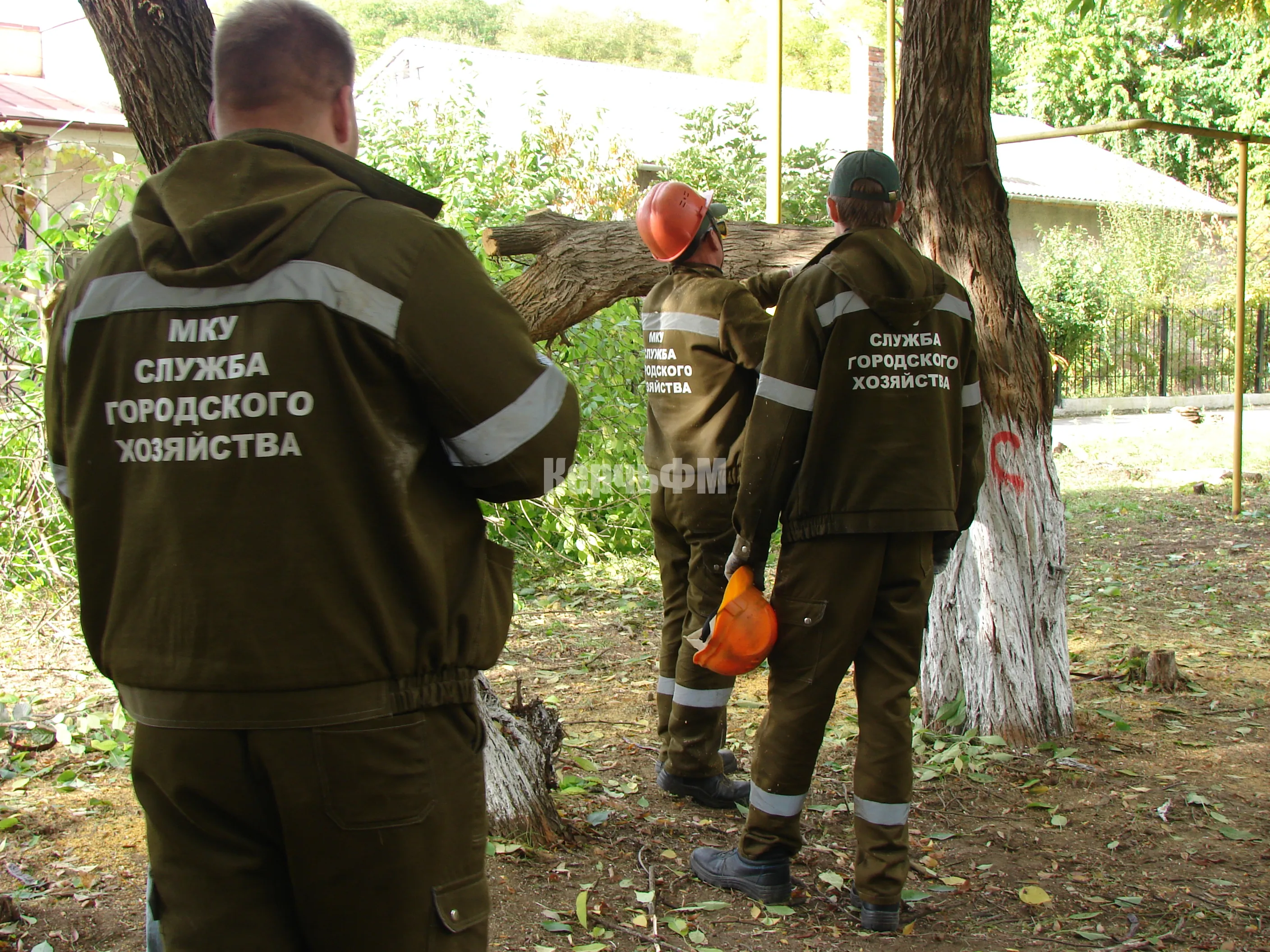 Специалисты Службы городского хозяйства Керчи ведут спил веток и стволов высоких деревьев в разных районах города.