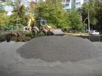 Тяжелая техника завезла на площадку необходимый объем сыпучих материалов.