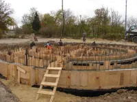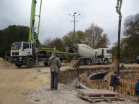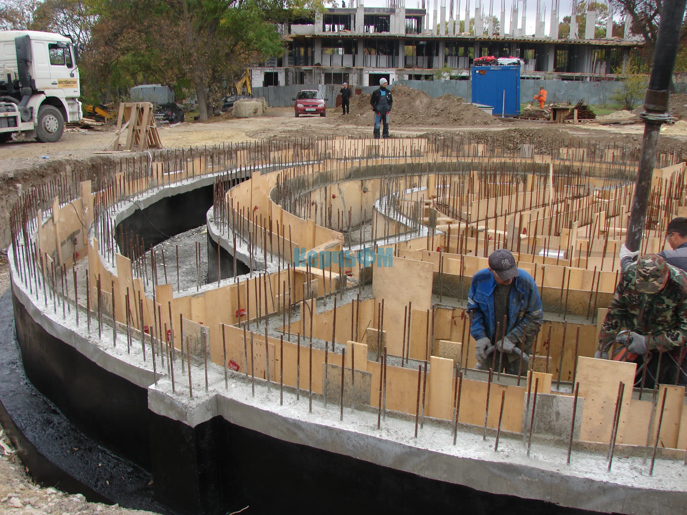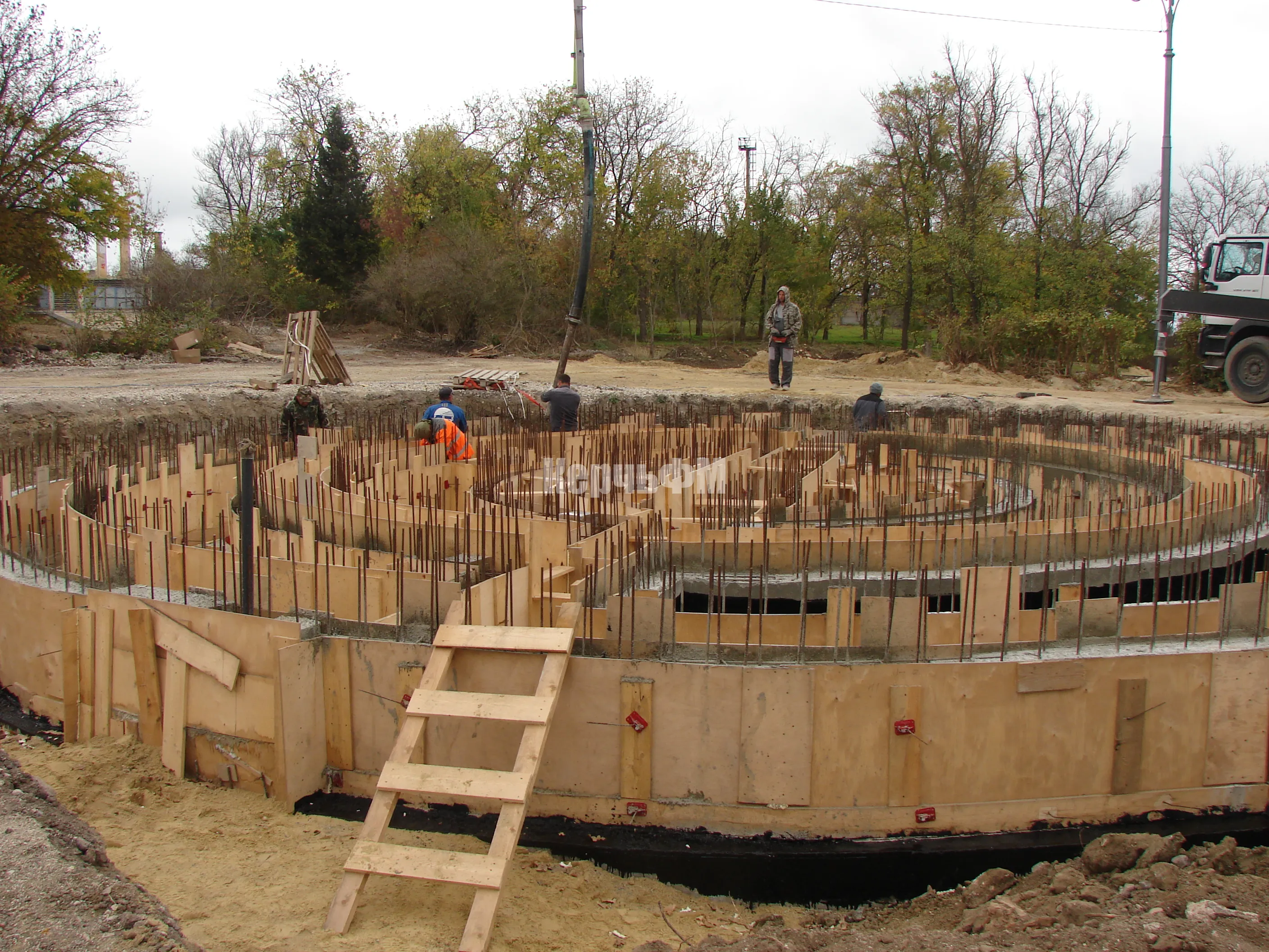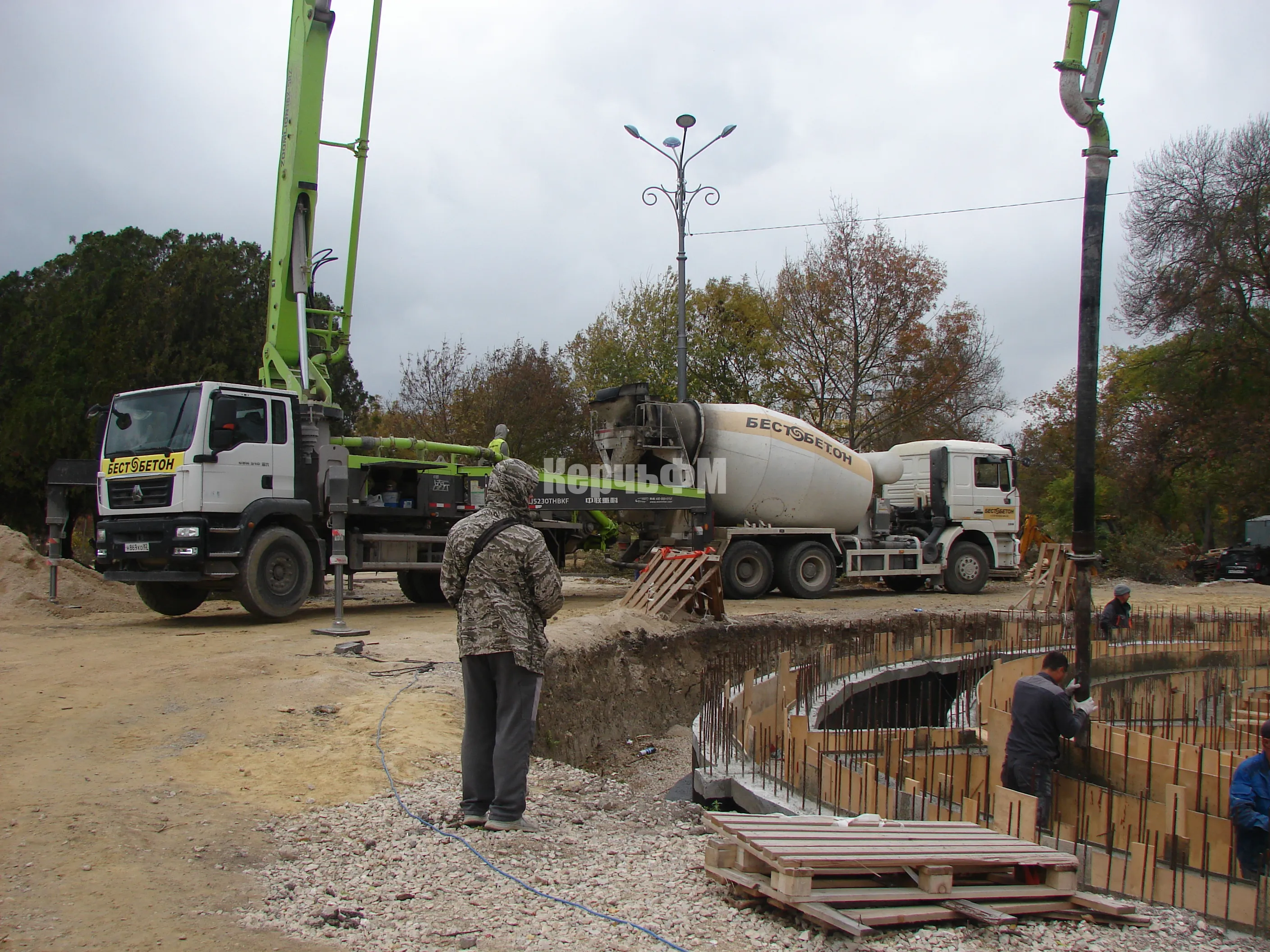 Работа кипит на строительстве фонтана: ведется заливка бетона для стен его чаши, передает КерчьФМ.