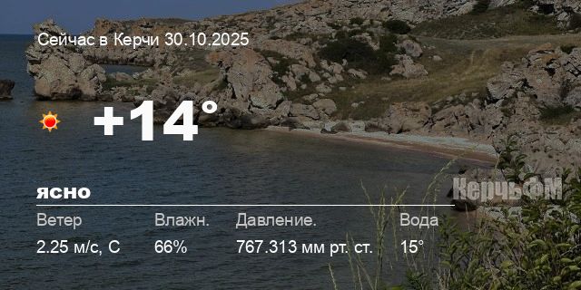 Сегодня днем в Керчи, 30 октября, ожидается ясная погода, температура воздуха от +11.8° до +16.2°С, ветер северный 3.99 м/с, порывы до 6.99 м/с, давление 767.3 мм рт. ст., влажность 61%.